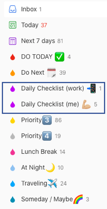 - Priority 2 — “next actions”. Set up filter to show these items in a separate list. Example: p2 & (overdue|tod|no date) & !(@Waiting💤)