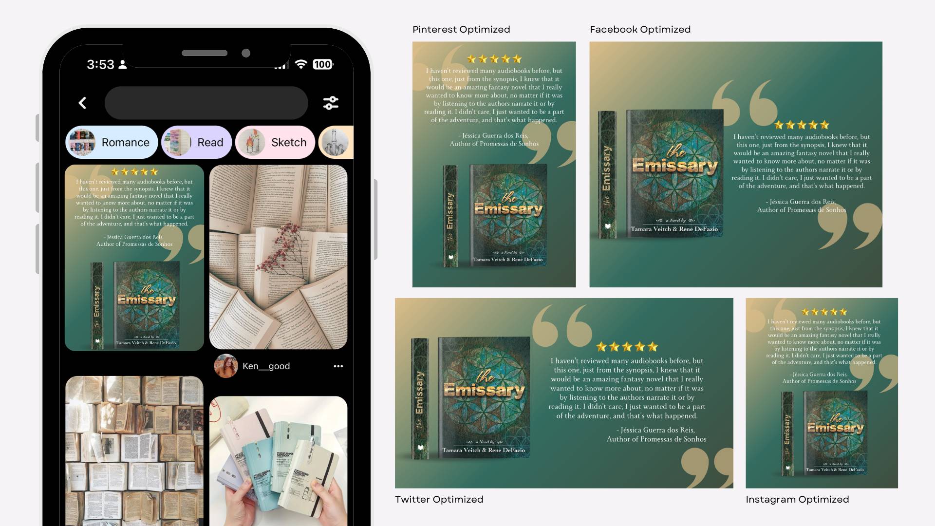 - The ability to feature quotes from your book reviews in the designs, giving you a powerful tool to share what readers are saying.